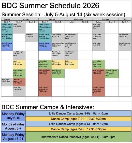 BDC offers weekly classes for our Summer Session July 5th-August 14th. We also offer week-long Summer Camps and Intensives. Whether continuing training or trying something new, summer is the perfect time to deepen skills and have fun.